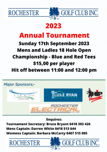 Rochester Annual Tournament September 17, 2023/in /by GCVadmin When 17/09/2023 11:00 am - 5:00 pm Add To Calendar Download ICS Google Calendar iCalendar Office 365 Outlook Live Where Rochester Golf Club Black Culvert Road, Rochester, Victoria, 3561 Map Unavailable https://www.golfcentralvictoria.com.au/wp-content/uploads/2019/08/golf-central-victoria.png 0 0 GCVadmin https://www.golfcentralvictoria.com.au/wp-content/uploads/2019/08/golf-central-victoria.png GCVadmin2023-08-22 18:45:122023-08-22 18:45:12Rochester Annual Tournament
