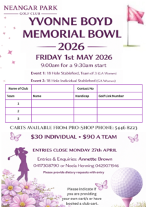 Yvonne Boyd Memorial Bowl May 1, 2026/in /by GCVadmin When 01/05/2026 9:00 am - 3:30 pm Add To Calendar Download ICS Google Calendar iCalendar Office 365 Outlook Live Where Neangar Park Golf Club Neangar Park Golf Club, 7 Averys Road, Eaglehawk, Victoria, 3556 Map Unavailable https://www.golfcentralvictoria.com.au/wp-content/uploads/2019/08/golf-central-victoria.png 0 0 GCVadmin https://www.golfcentralvictoria.com.au/wp-content/uploads/2019/08/golf-central-victoria.png GCVadmin2026-02-01 14:39:442026-03-25 16:06:37Yvonne Boyd Memorial Bowl
